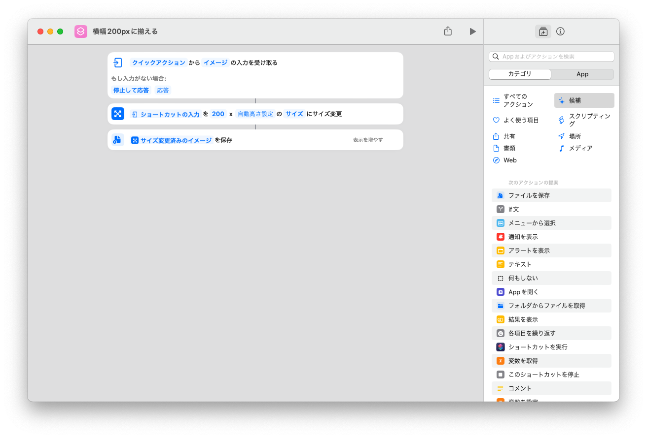 ショートカットを入れていただき、右クリックのクイックアクションで「横幅200pxに揃える」が出てくるように設定します。